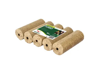 Briquettes de bois tendre avec trou de tirage intégré, fabriquées au Tyrol à partir de bois certifié PEFC. Les briquettes sont composées de bois tendre compressé sans additifs ni liants artificiels.