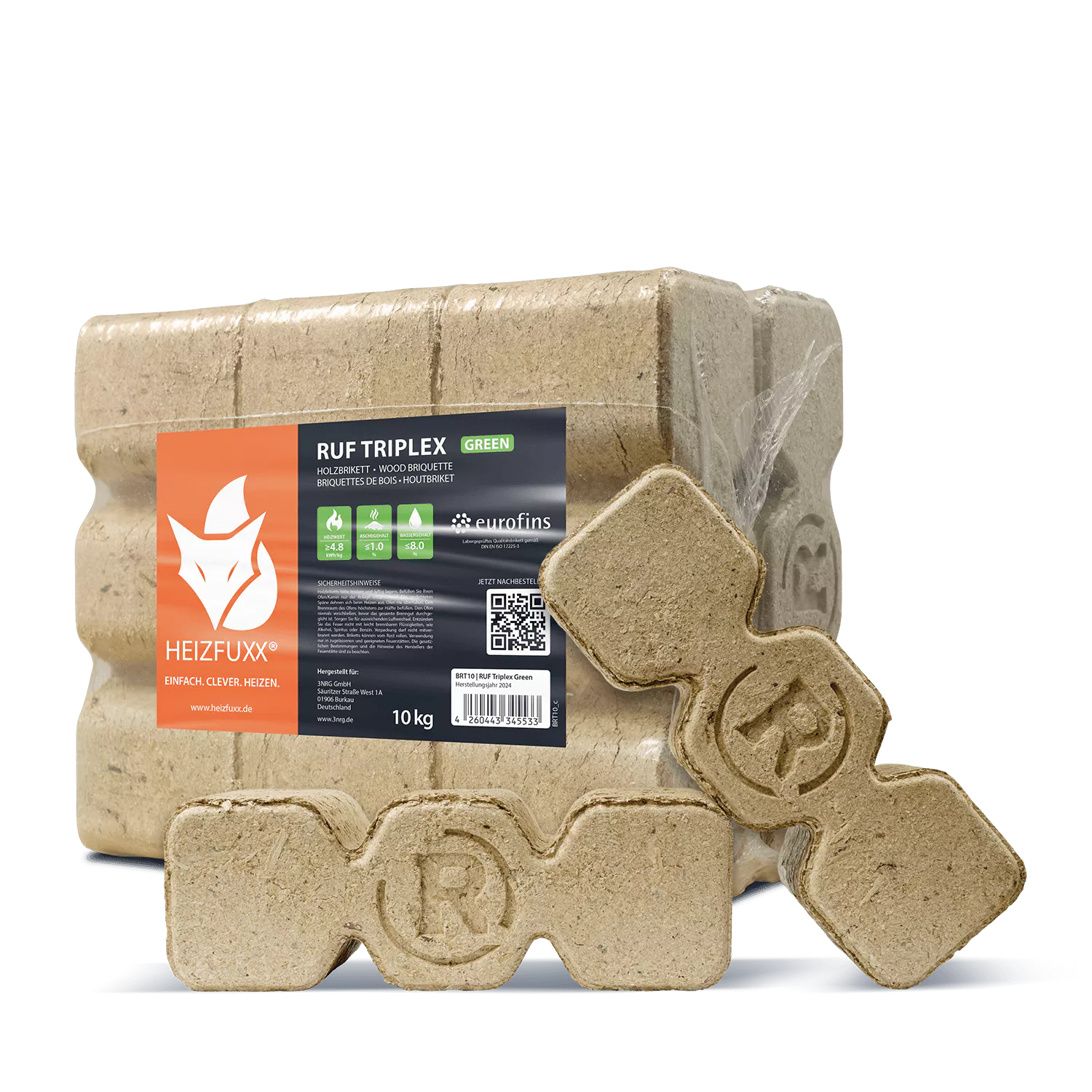 Les briquettes de bois tendre RUF Triplex Green sont fabriquées à partir de copeaux de bois séchés et laissés à l’état naturel, sans aucun additif chimique. Grâce à une densité de pressage élevée et à la forme caractéristique Triplex avec rainures d’aération intégrées, elles favorisent une circulation d’air régulière dans la chambre de combustion.