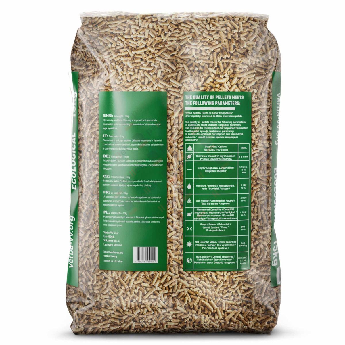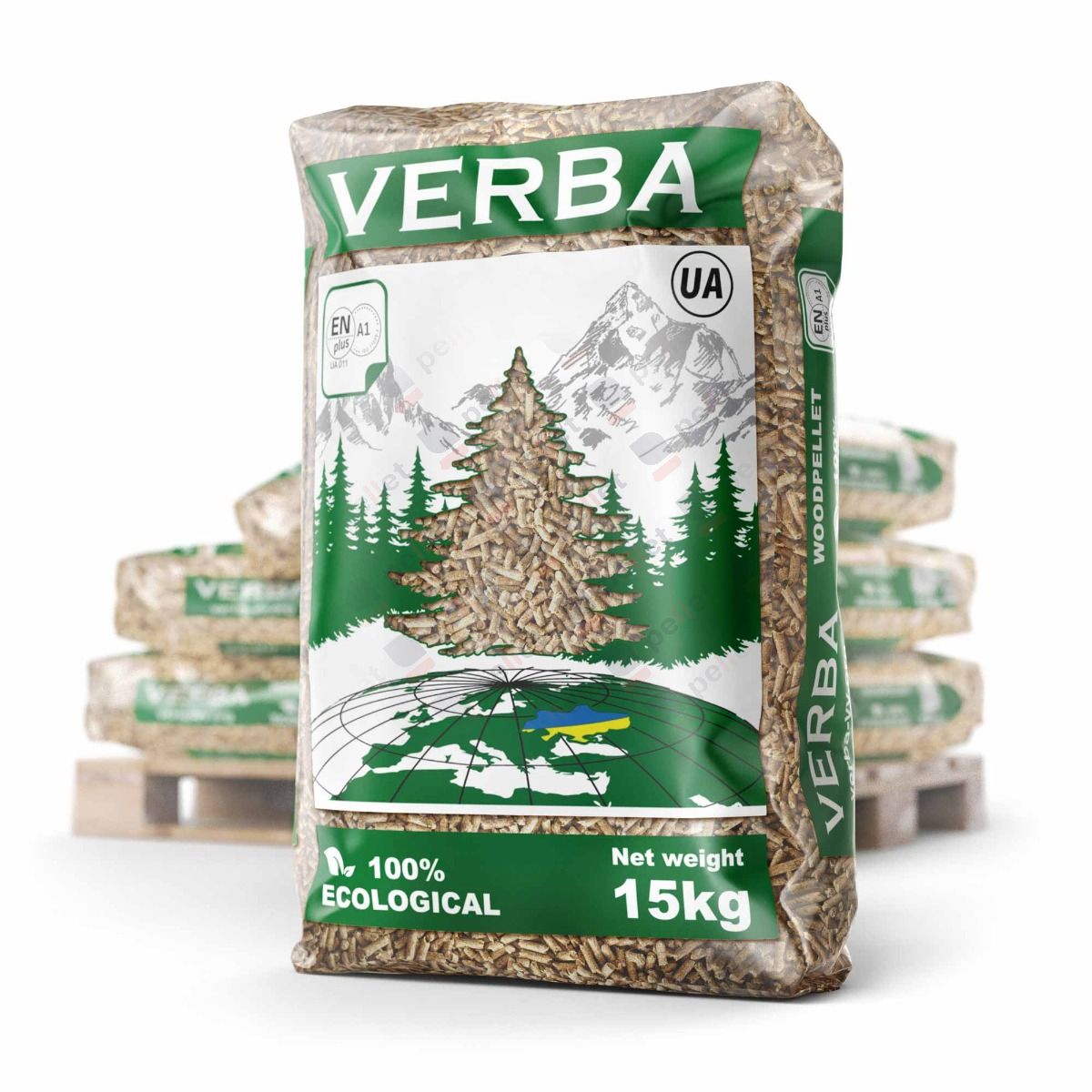 Granulés de bois VERBA ENplus® A1 (certificat UA011) en bois de conifères (pin, épicéa) sans additifs. Pouvoir calorifique ≥ 4,90 kWh/kg (≥ 17,70 MJ/kg), teneur en cendres ≤ 0,50 %, humidité ≤ 7,10 %, diamètre 6 mm.